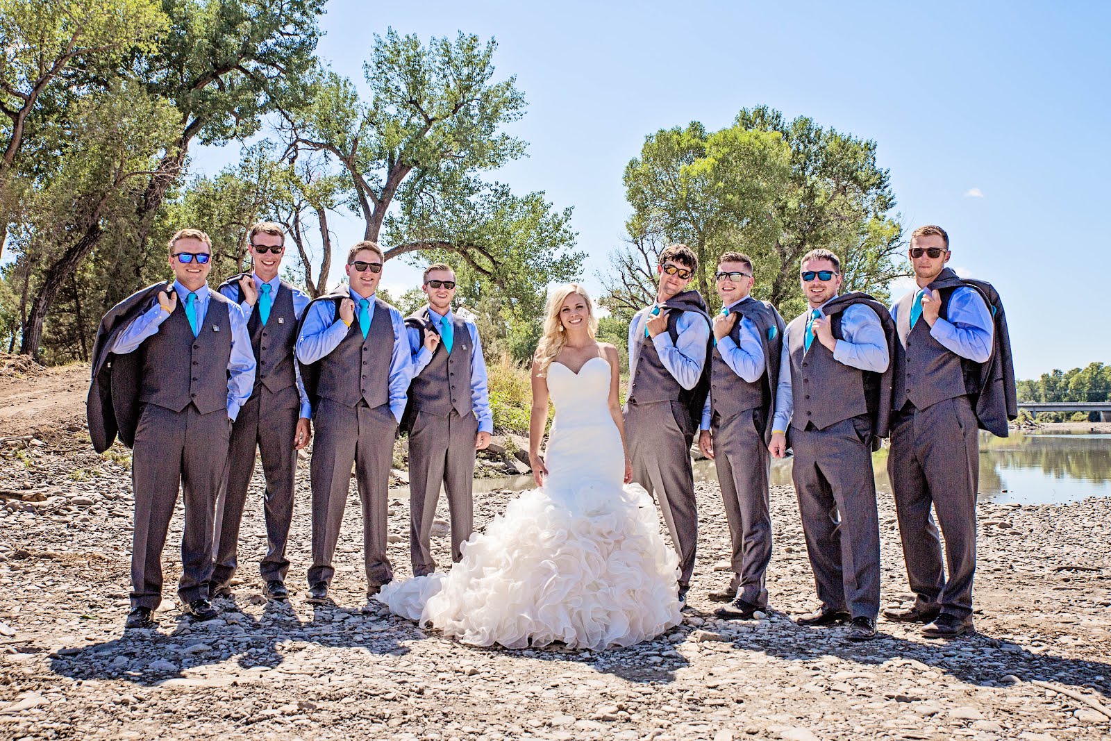 THIS WEDDING!!! THIS COUPLE!!! I cannot even tell you the joy that filled this day. The bride was a beauty, inside and out. Every single person that spoke to her told her of her kindness and beauty, inside and out. She was calm and collected the entire day, and if anything stressful came up, her and her now HUSBAND handled it great. He was so fun and supportive, and I think his friends know him as the life of the party. We started the day in the 100 degree heat, taking photos of the bridesmaids in their perfectly matching robes. I loved hearing their giggles as they held hands and walked past the grooms room, making sure he didn't see his bride. After the bridesmaids we made our way down to the bank of the river for a bride/father, mother/groom and bride/groom first look! There were more than a few tears shed, and so many happy, happy smiles were shared. I could feel the love that each of these couples had for one another. All of the group photos were taken before the ceremony, in the 100 degree heat and sun! We did it as quick as we could, but they were all such a hoot and kept the spirits up despite the sweat we were all covered in. Next was the ceremony that went off without a hitch! Sweet vows were said and then we headed into the giant, and beautifully decorated barn for the reception. Lights were strung, centerpieces were perfect, even the coloring pages were printed with the couples recent photos. Photo booths and plenty of drinks and food were served-and then, the DANCING. This was one dancing group if I do say so myself. The bouquet was tossed and the garter was thrown, followed by a cake cutting to top it all off. The Yeti cake made me feel like I was truly in Montana! I hugged this bride goodbye and I miss her every time I see a pictures of them. I will always count this as one of my favorite weddings! Enjoy!